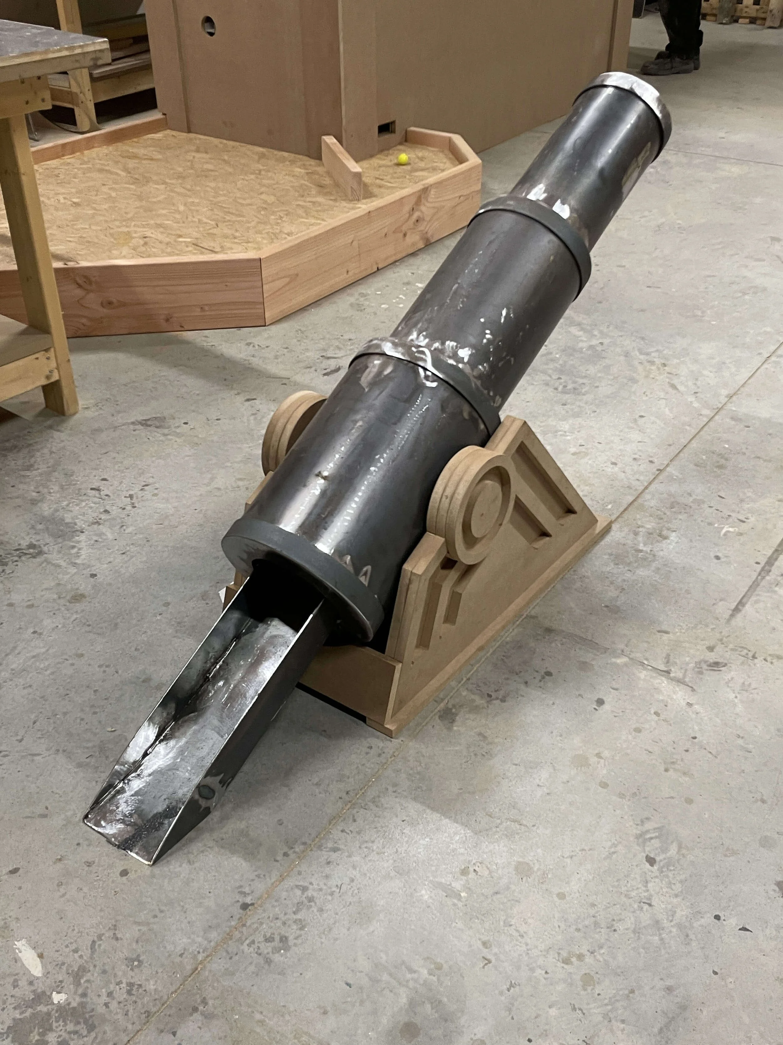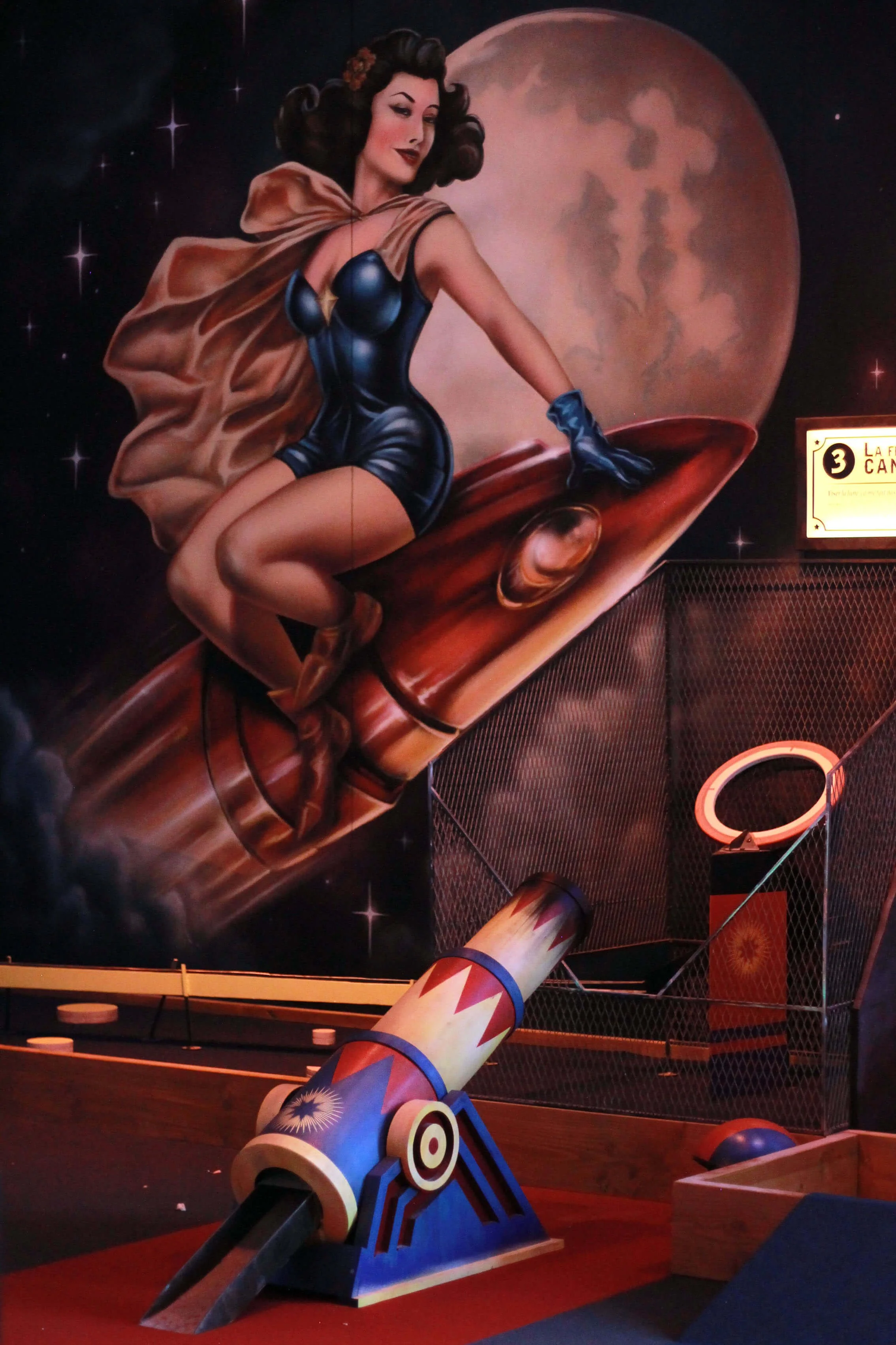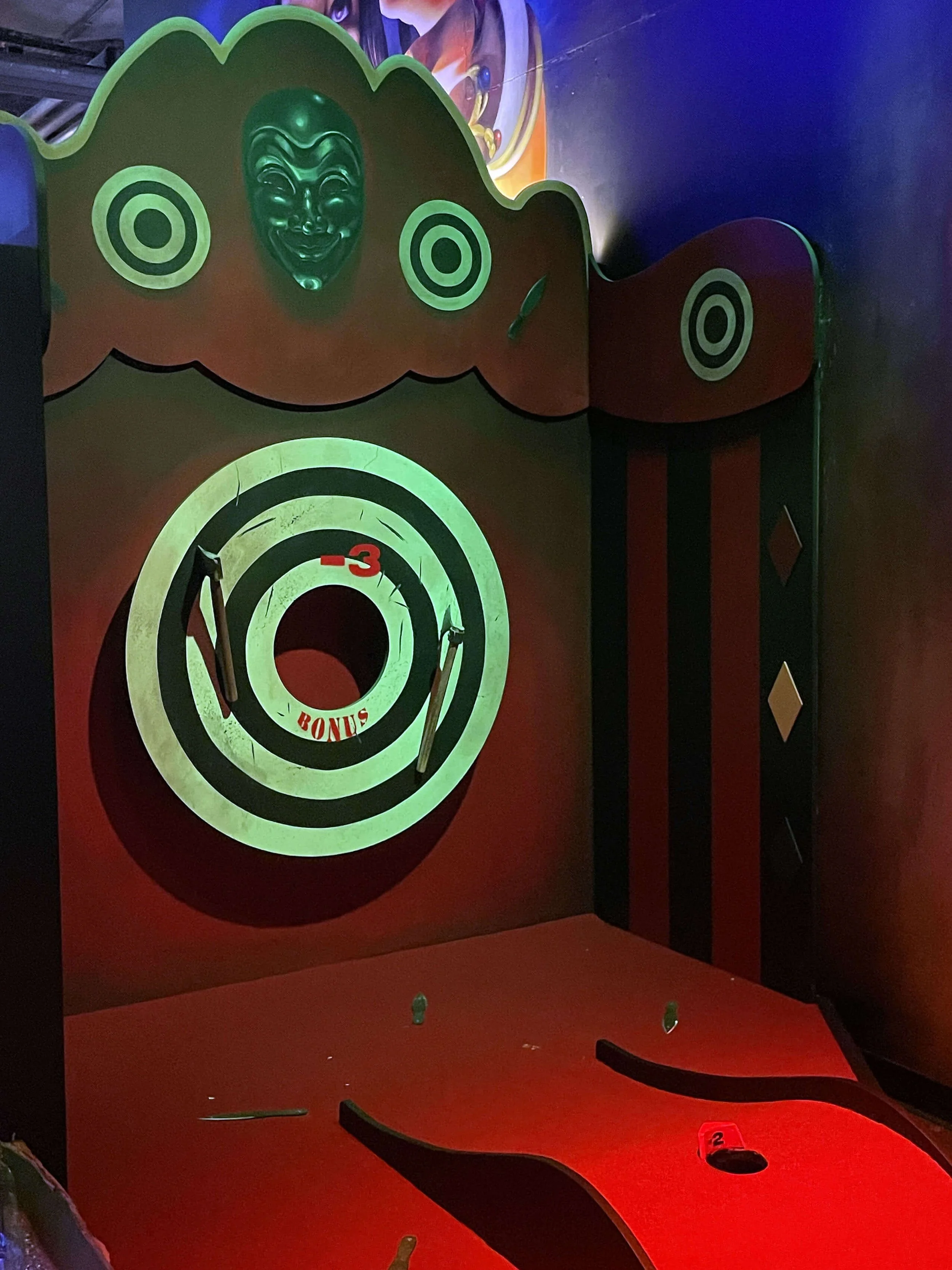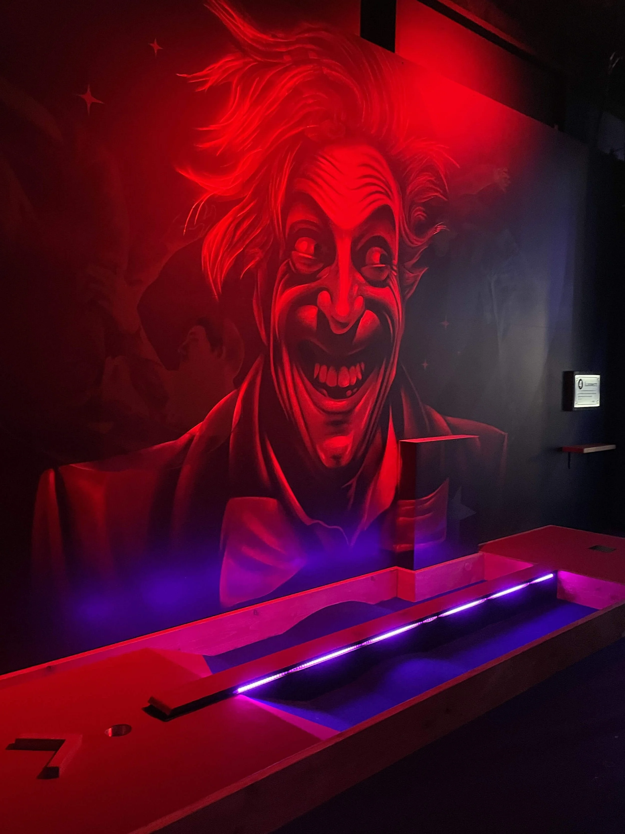 Nous avons conçu, fabriqué et posé l’ensemble de l’aménagement de ce mini golf indoor de 200 m² situé à Bordeaux. En déambulant de piste en piste, on y croise des structures bois monumentales, une sculpture de crâne en acier, un canon, un looping d’1m80 de diamètre, un palais des glaces ou encore des enseignes lumineuses sur mesure !