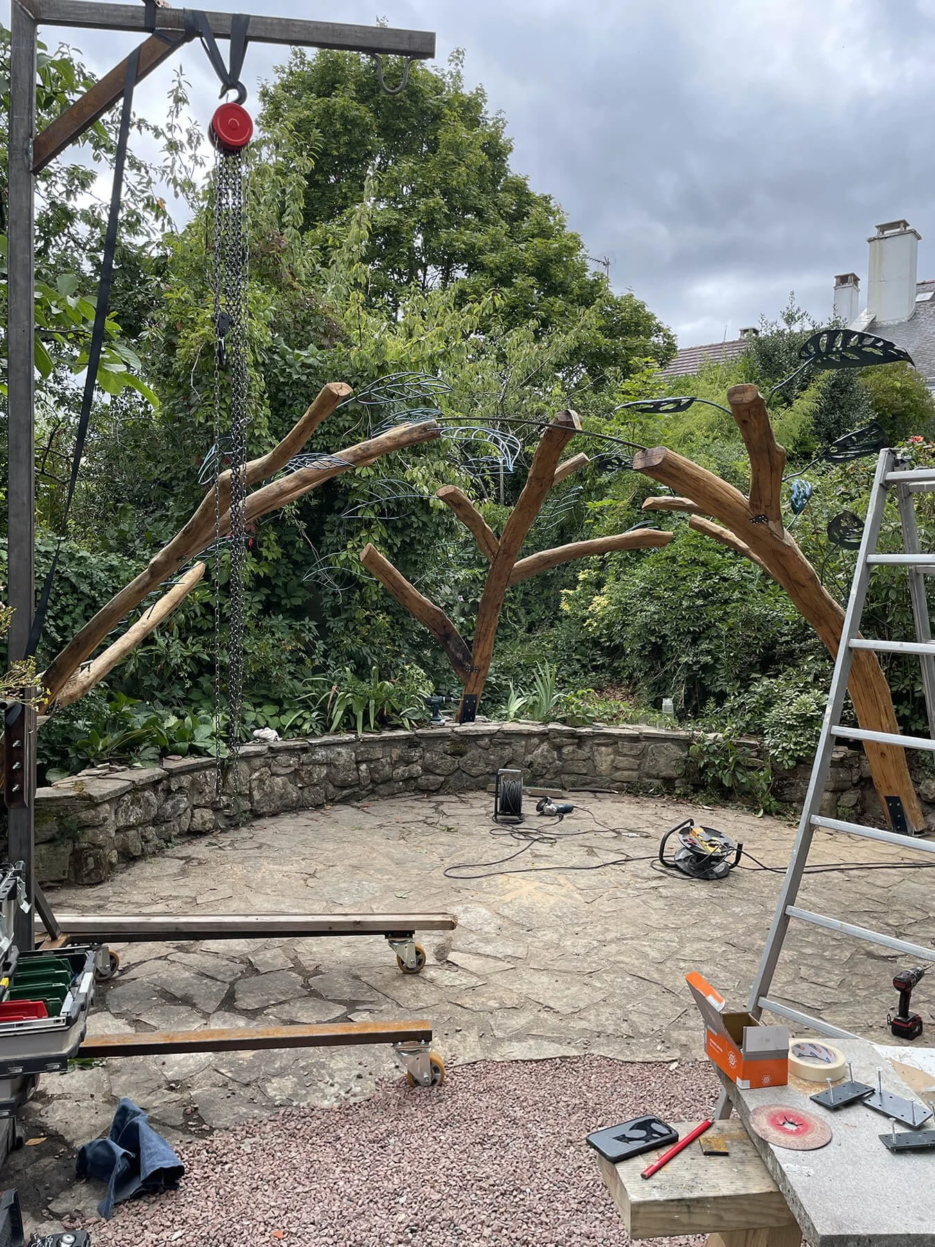 Installée au coeur d’un luxuriant jardin nantais, cette pergola sculpturale a pour vocation de créer un espace convivial où se rassembler, et sur lequel grimperont des plantes avec les années, offrant un doux ombrage lors des périodes estivales.