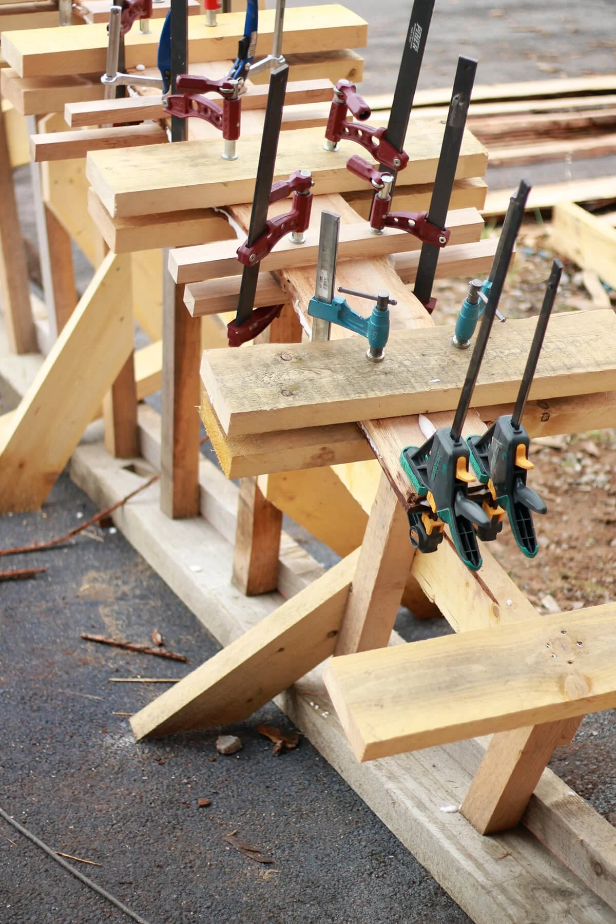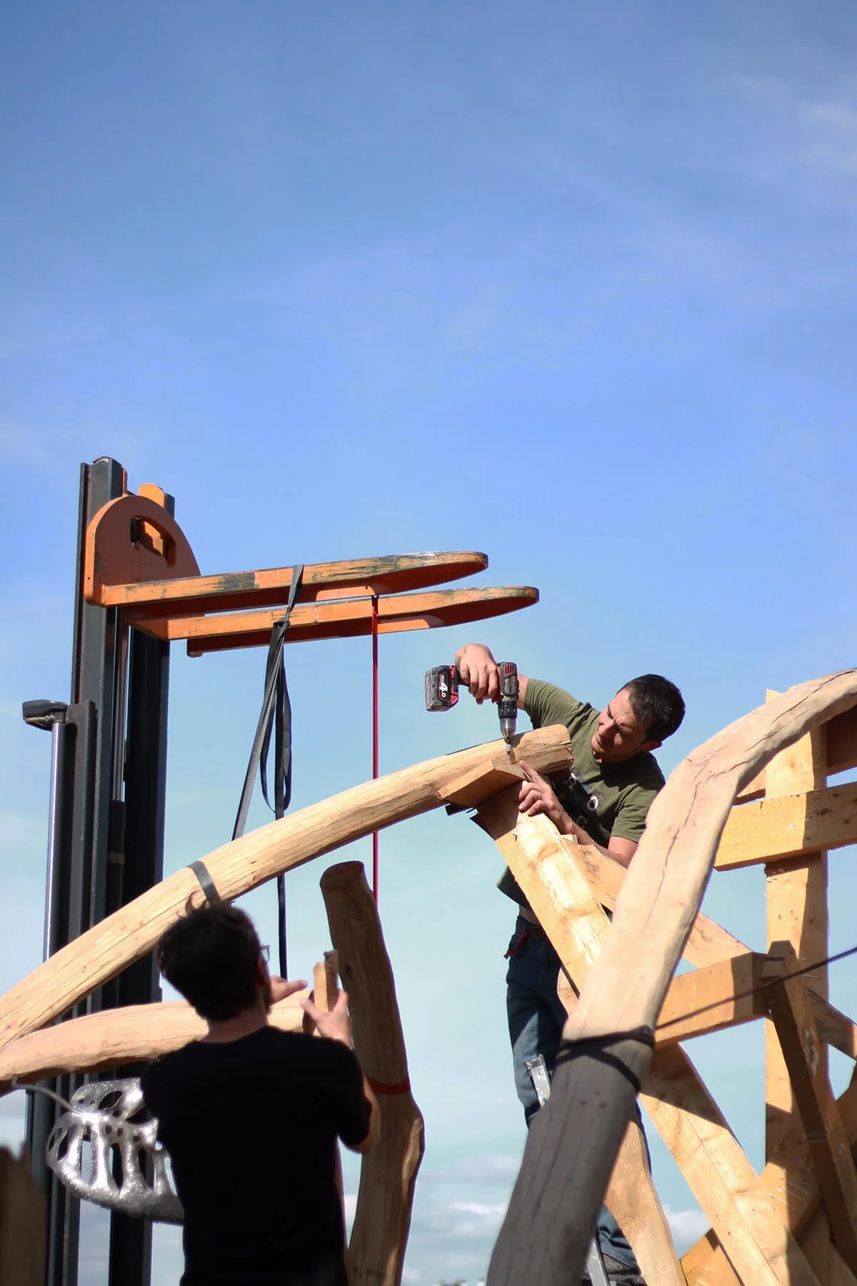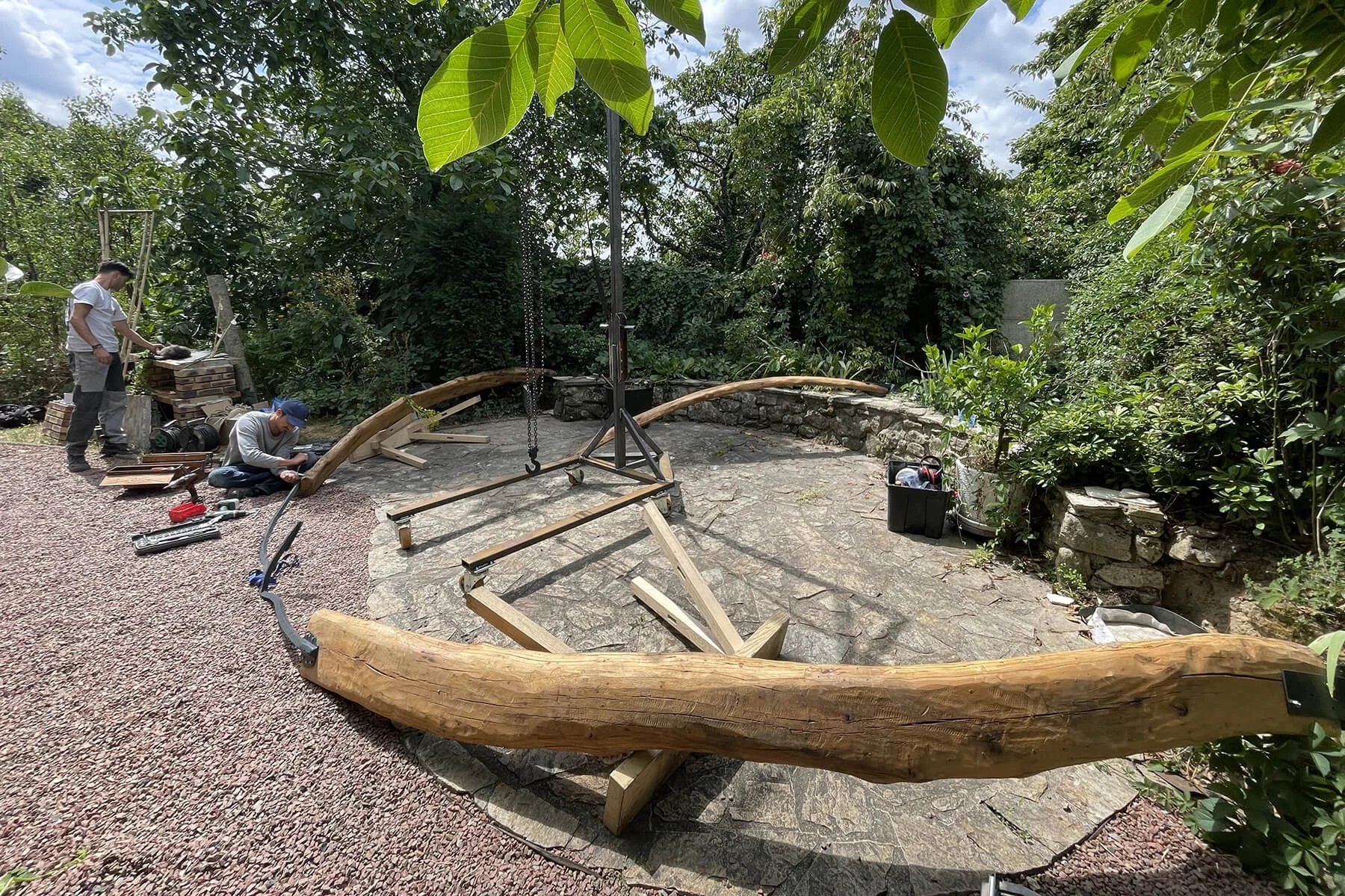 Les éléments en bois sont réalisés à partir de troncs de chênes délignés en fines lames, puis recomposés afin de pouvoir leur donner la courbure souhaitée. Cette technique inédite a été développés à l’occasion de ce projet, notamment grâce à la confiance de Nicolas et Rémi qui ont accepté de nous suivre dans cette idée un peu folle.